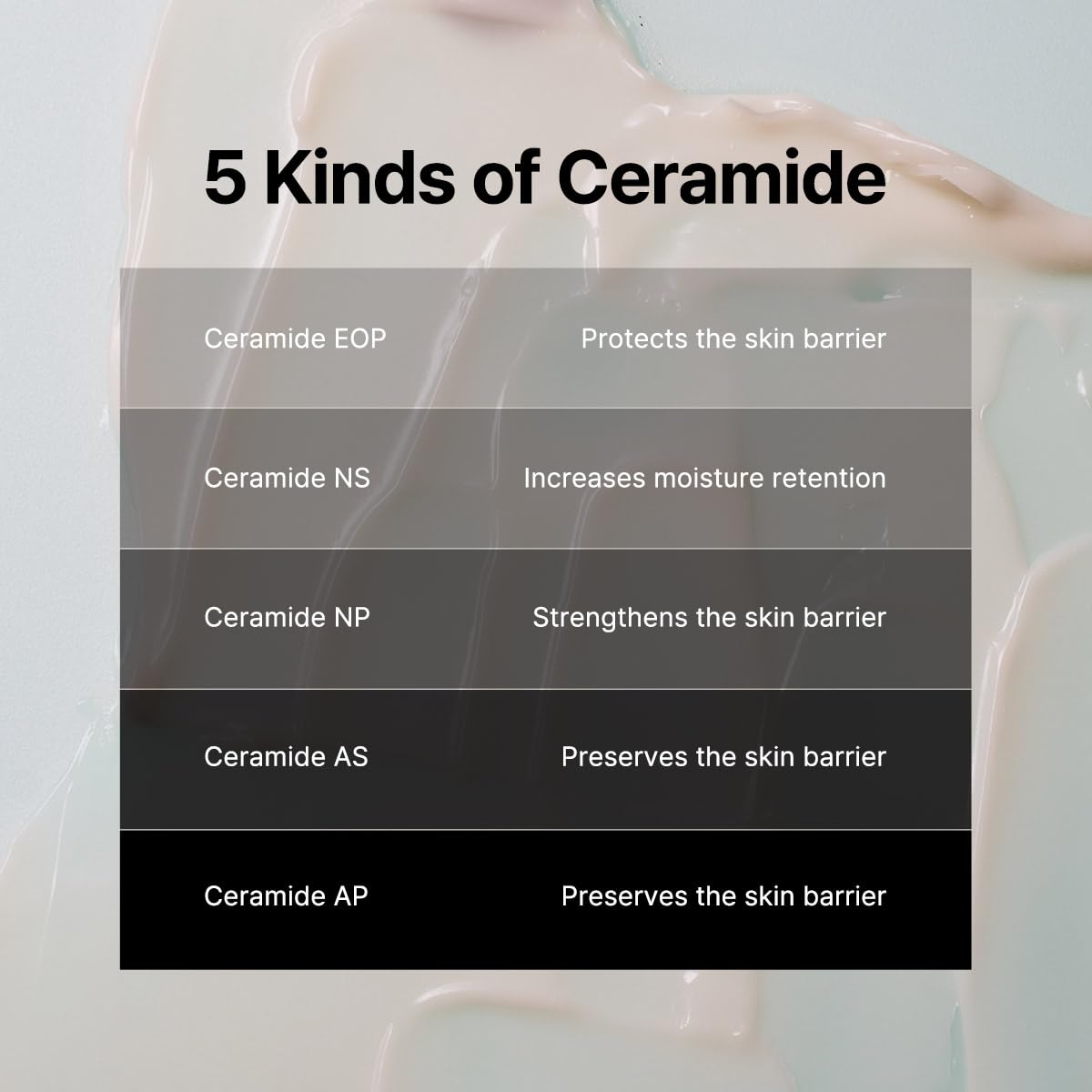 Ceramides (NP, NS, AP, AS, EOP) – Help strengthen the skin barrier and reduce moisture loss.